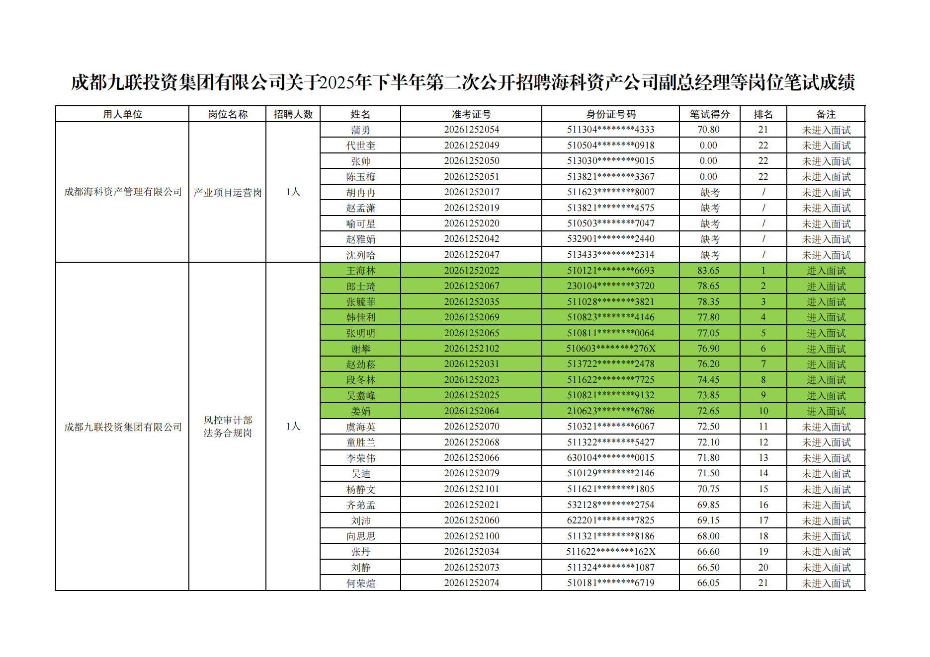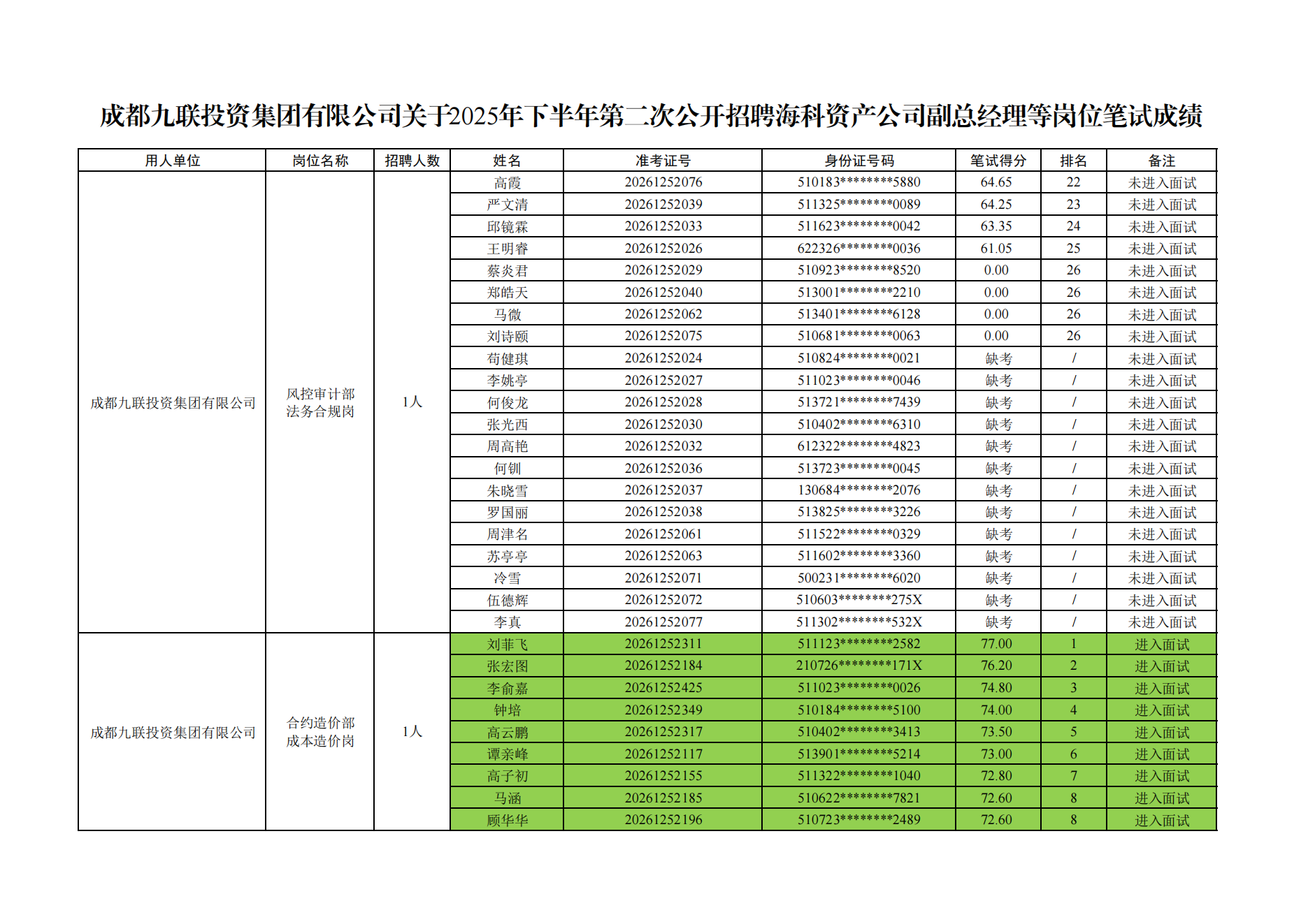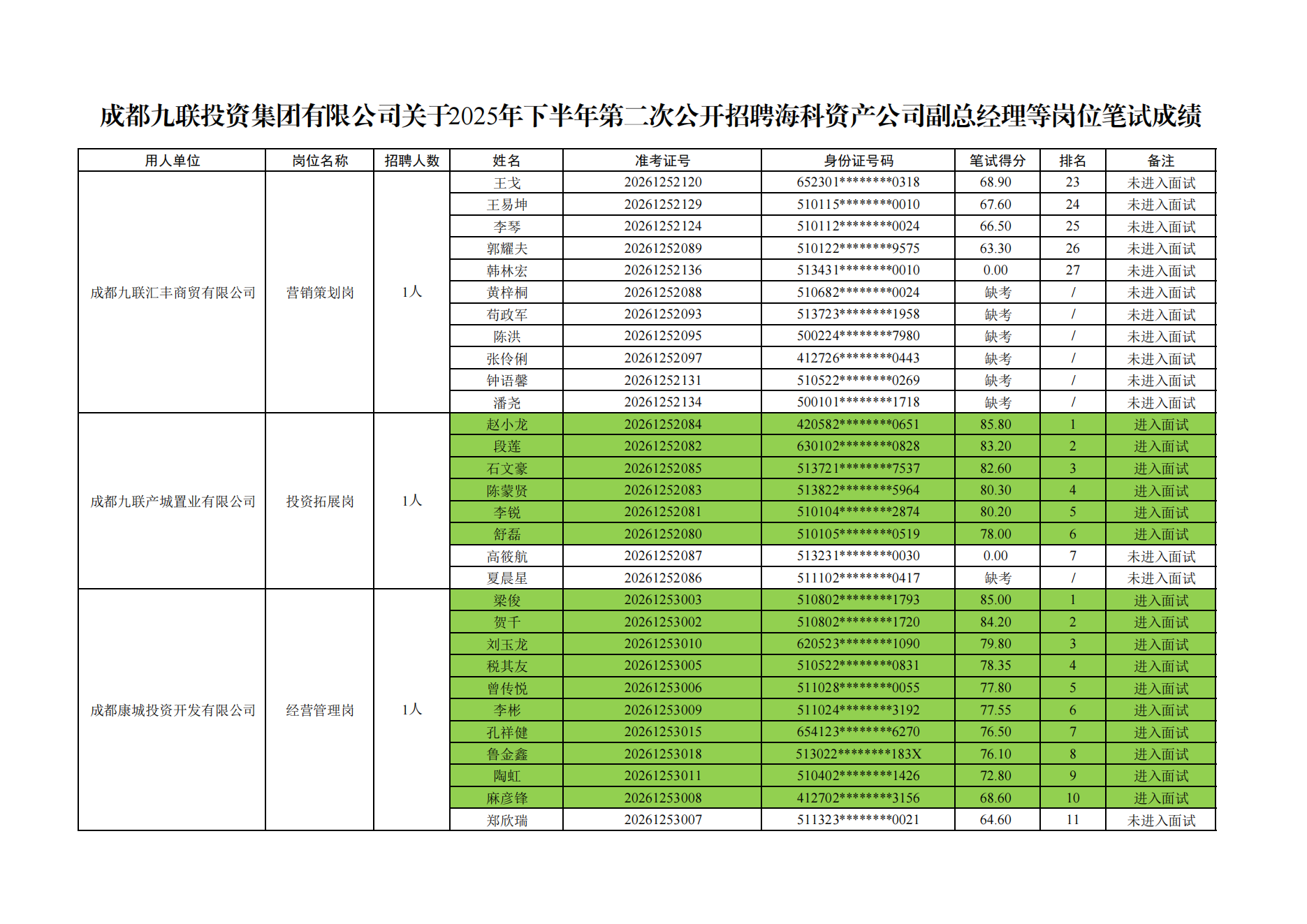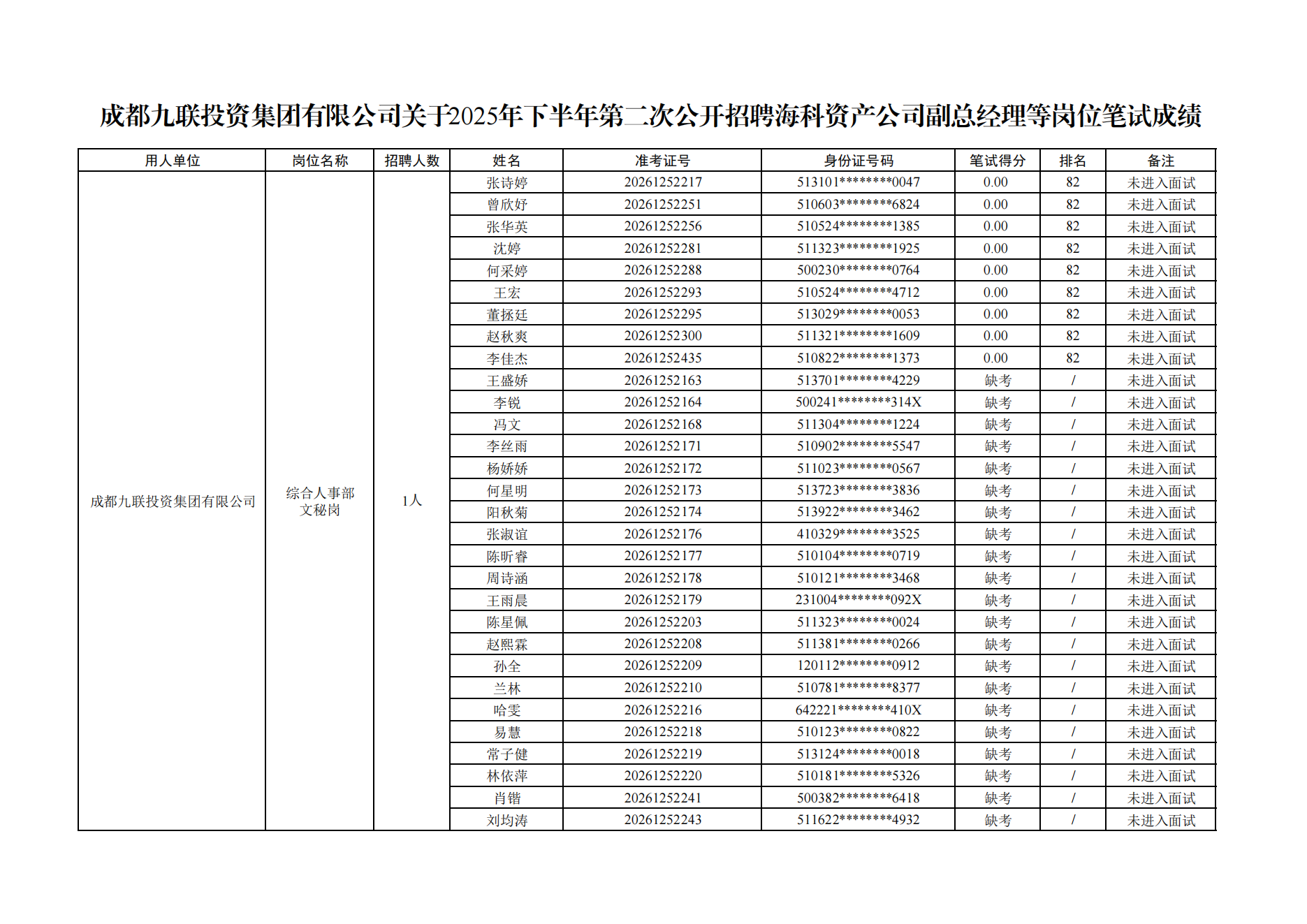 笔试成绩:详见附件:成都九联投资集团有限公司关于2025年下半年第二次公开招聘海科资产公司副总经理等岗位笔试成绩。