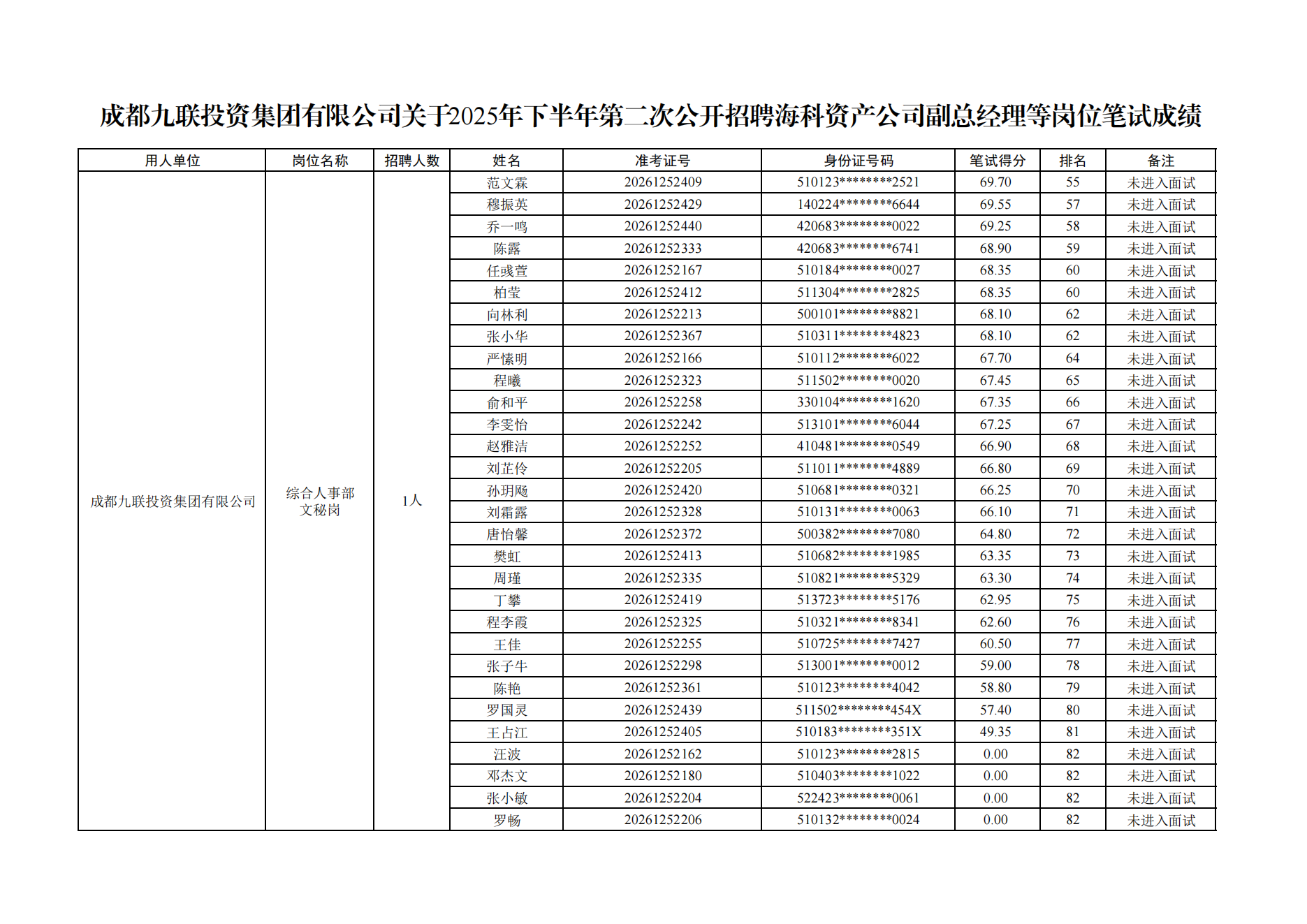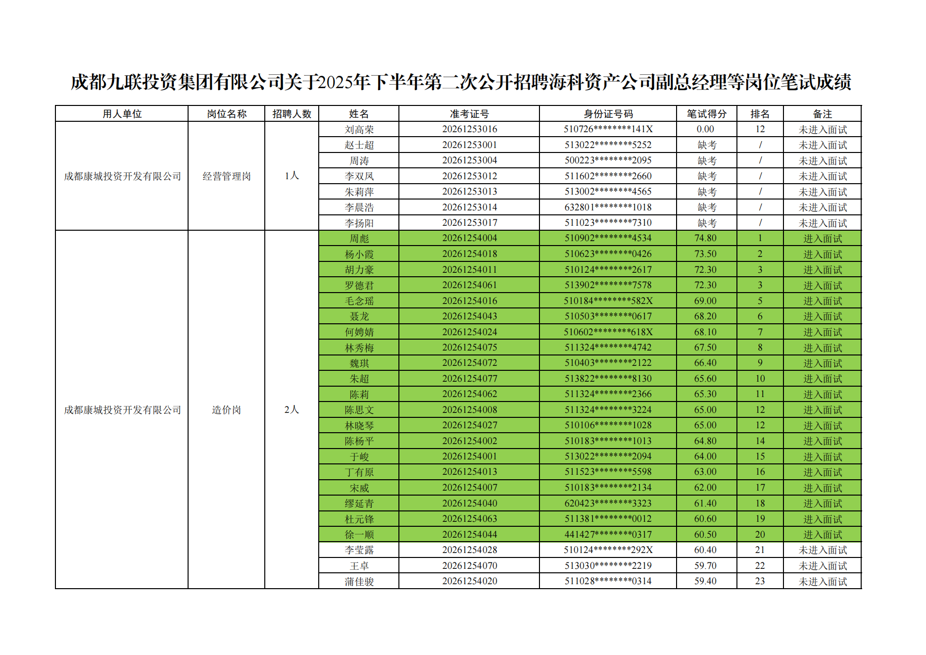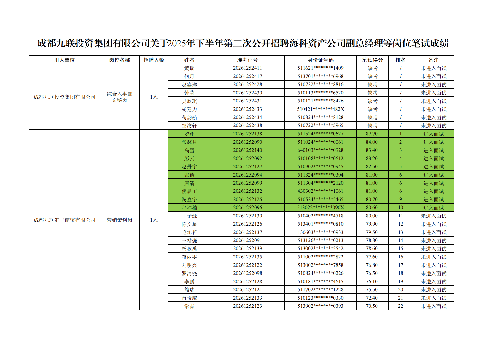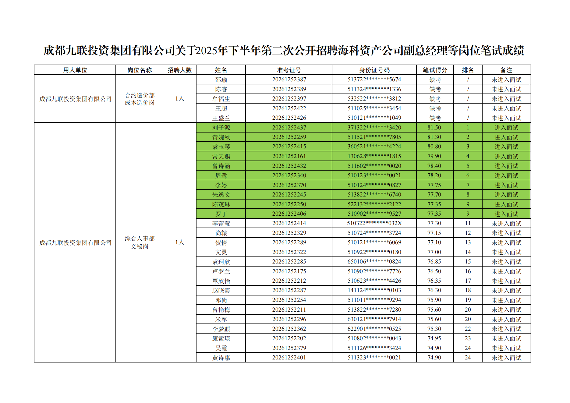根据成都九联投资集团有限公司2025年12月31日发布的招聘公告及招聘相关规定,现对进入笔试环节的应聘人员成绩予以公示。