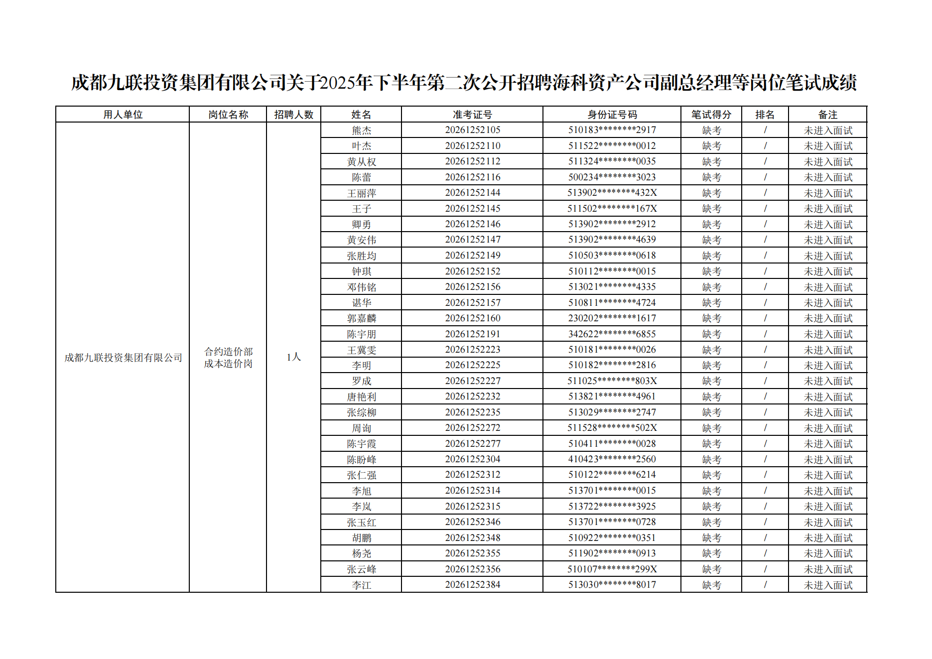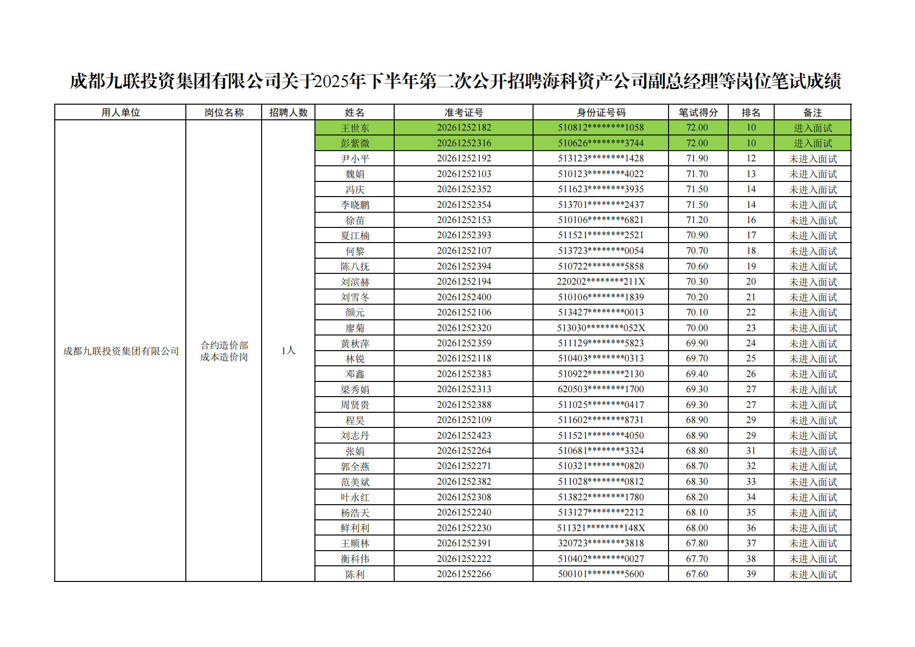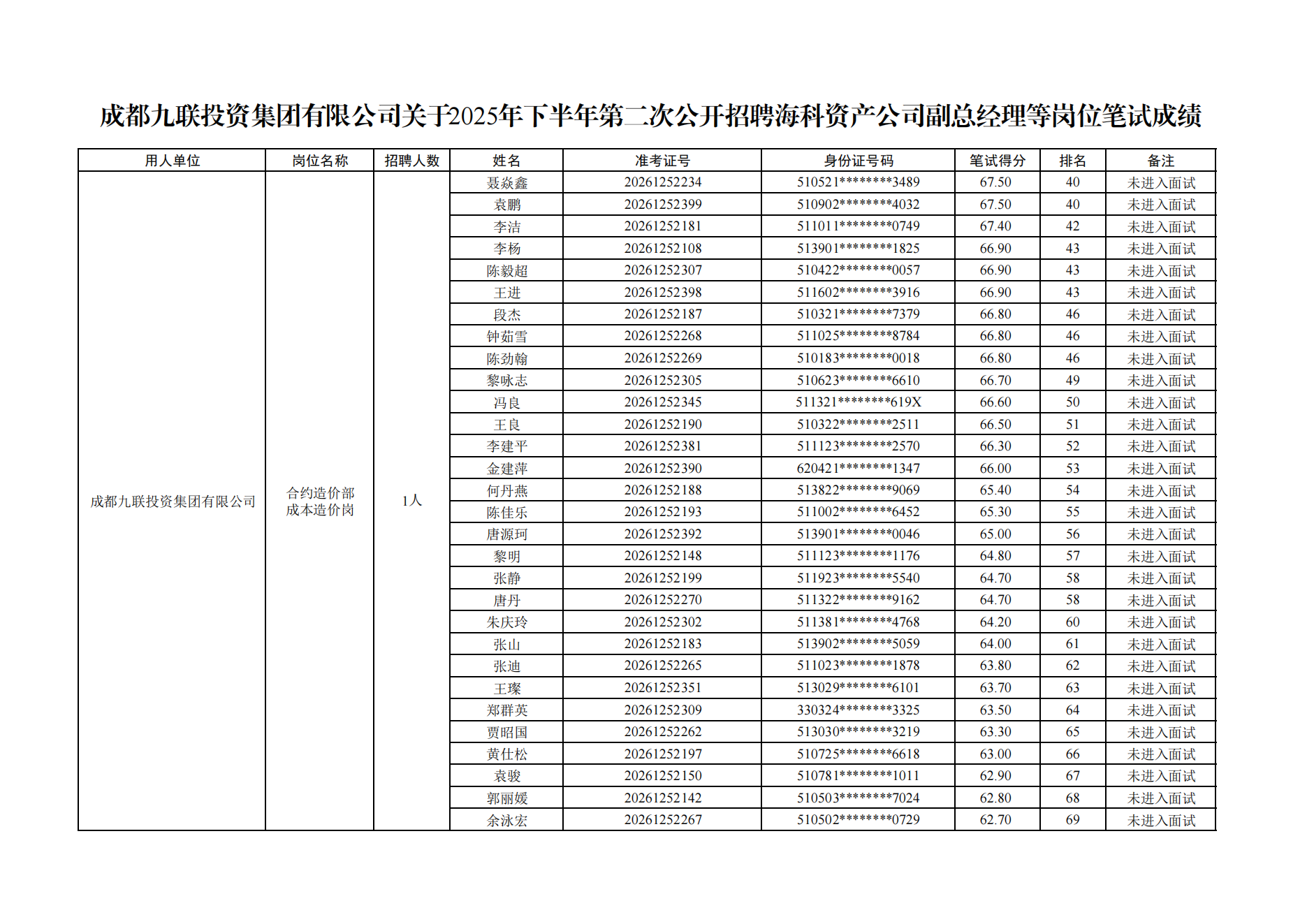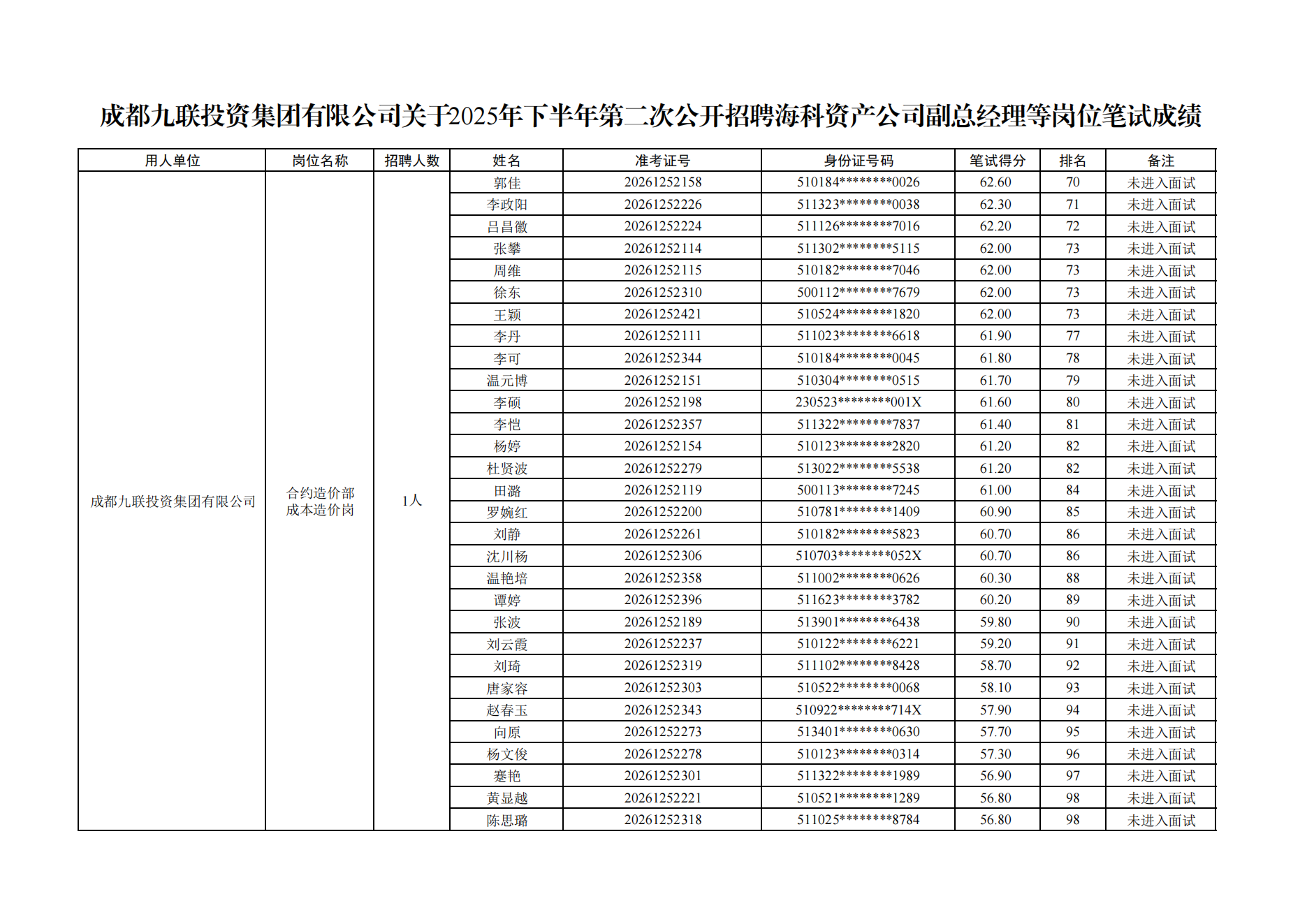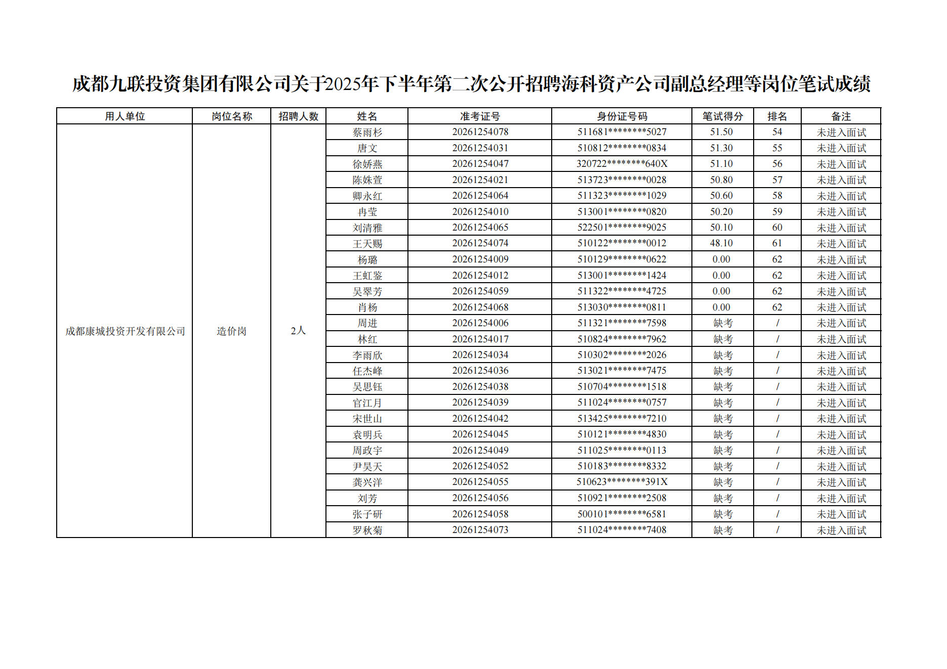 根据成都九联投资集团有限公司2025年12月31日发布的招聘公告及招聘相关规定,现对进入笔试环节的应聘人员成绩予以公示。