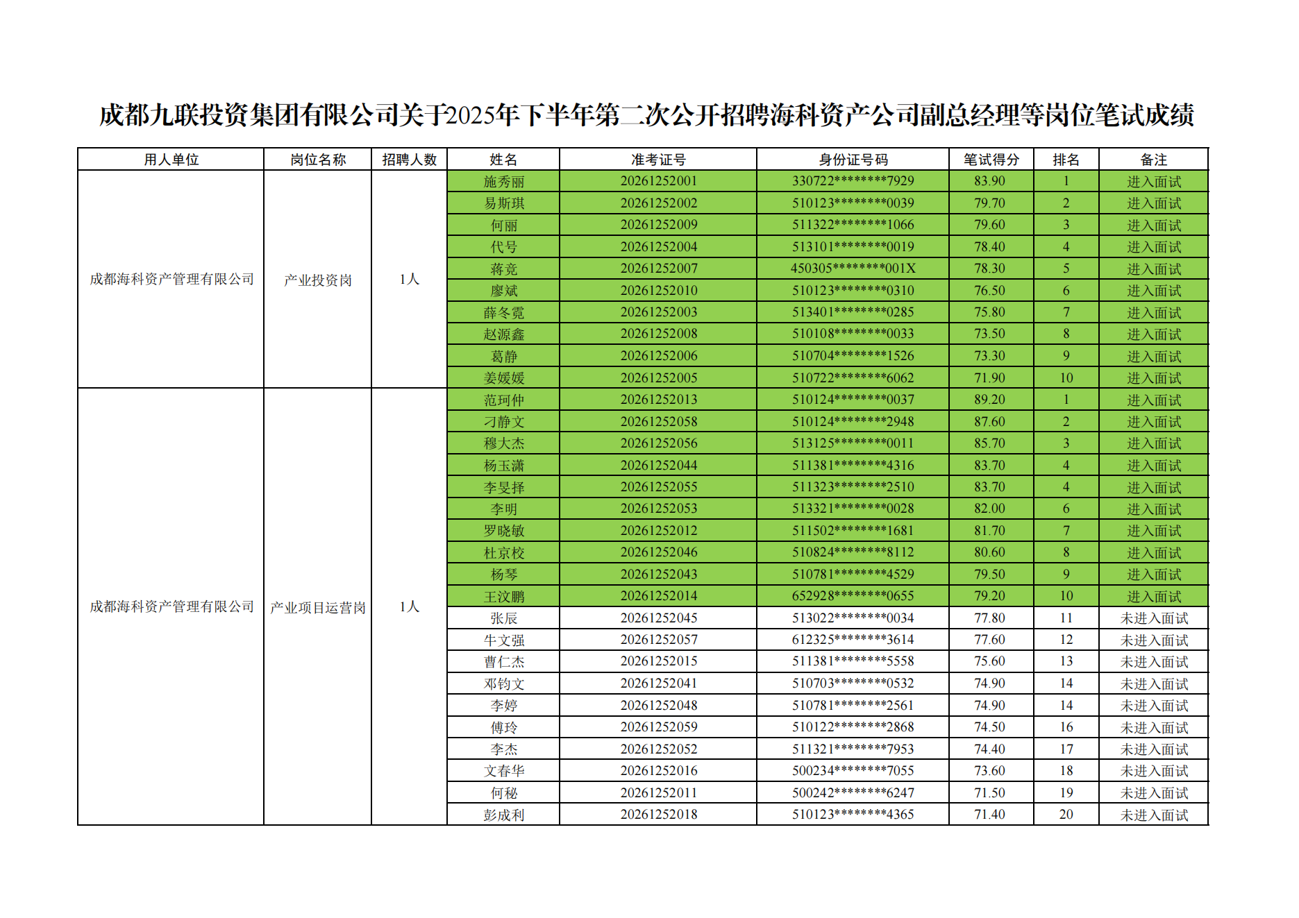 成都九联投资集团有限公司关于2025年下半年第二次公开招聘海科资产公司副总经理等岗位笔试成绩公示