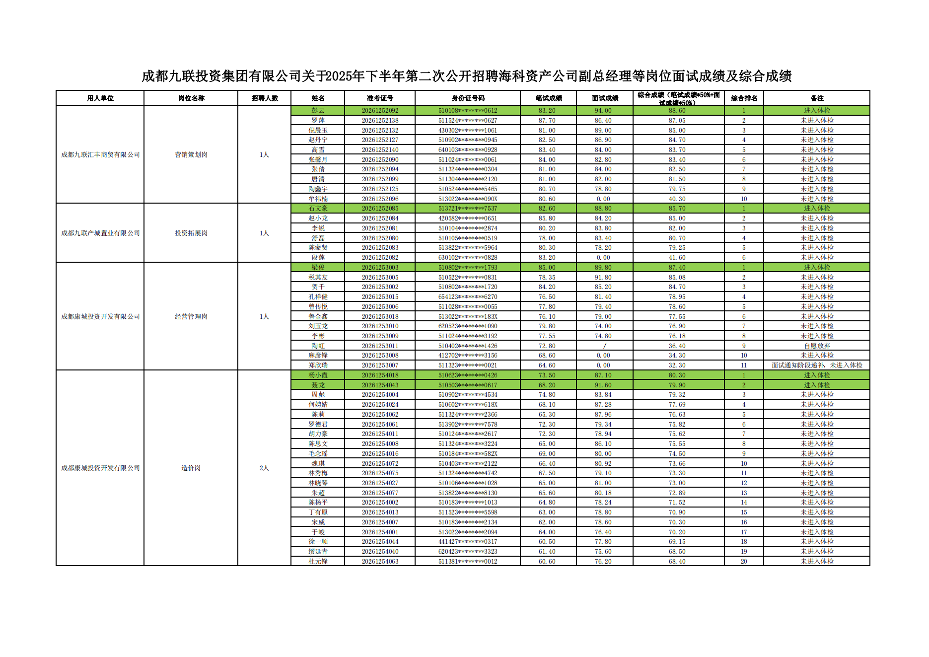 根据成都九联投资集团有限公司2025年12月31日发布的招聘公告及招聘相关规定,现对进入面试环节的应聘人员成绩予以公示。