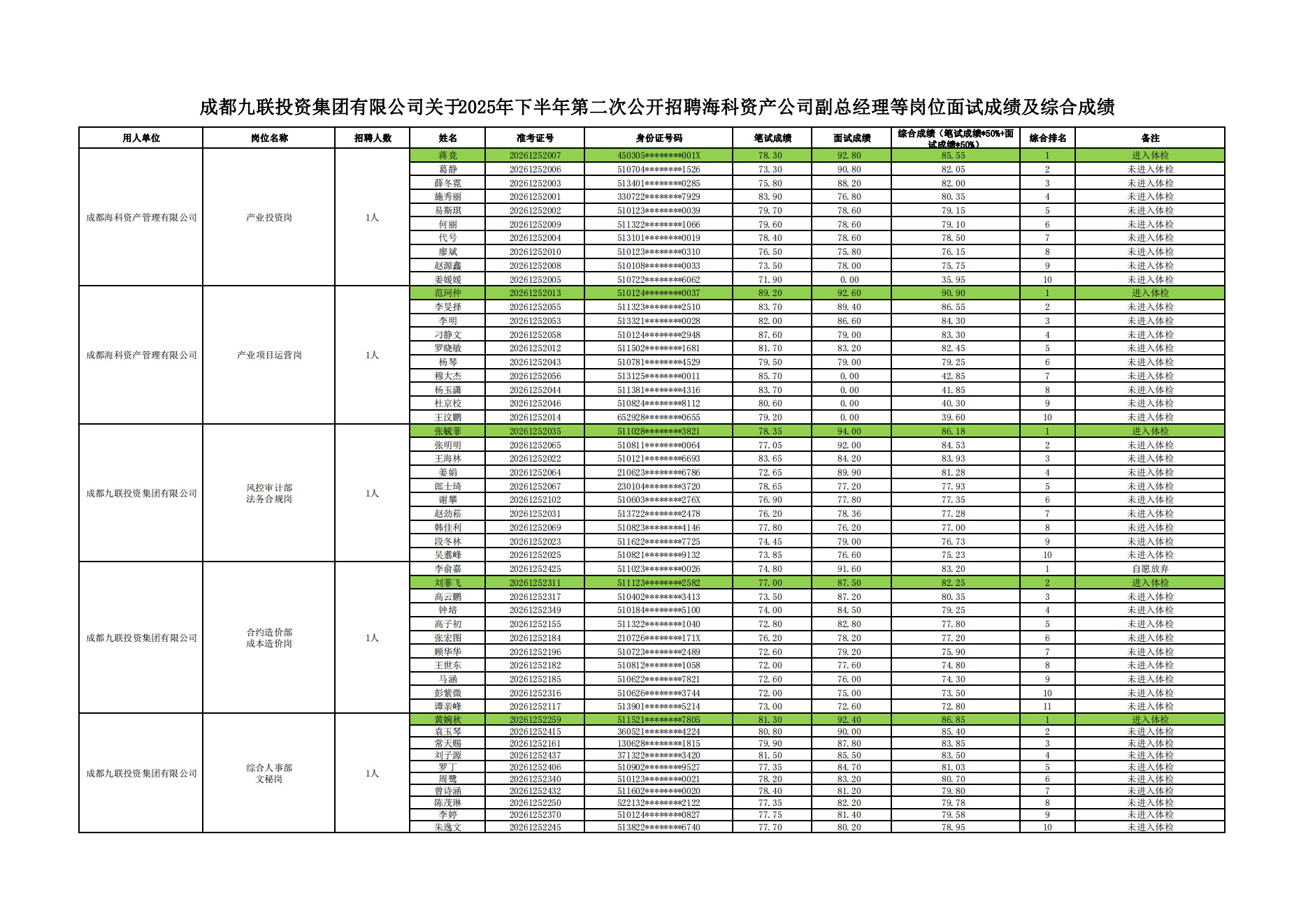 成都九联投资集团有限公司关于2025年下半年第二次公开招聘海科资产公司副总经理等岗位面试成绩公示
