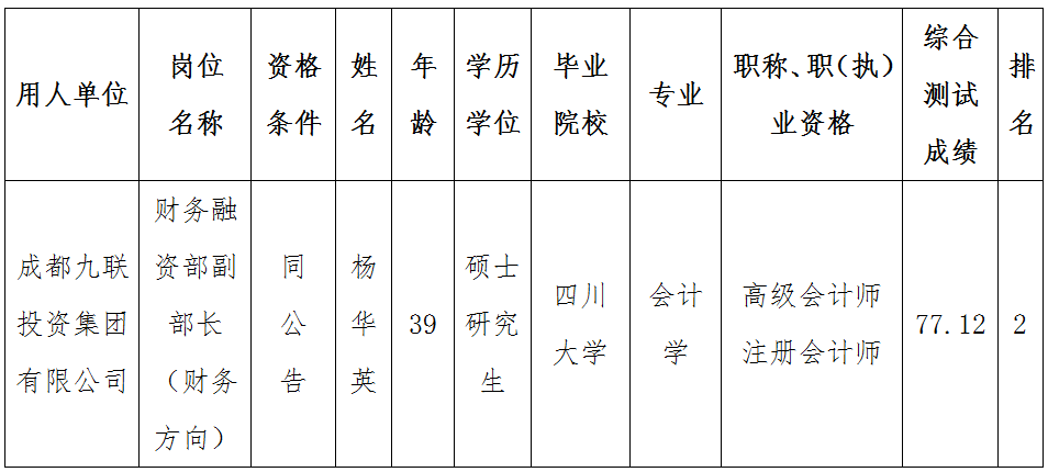 成都九联投资集团有限公司关于公开招聘财务融资部副部长(财务方向)岗位拟聘人员名单公示